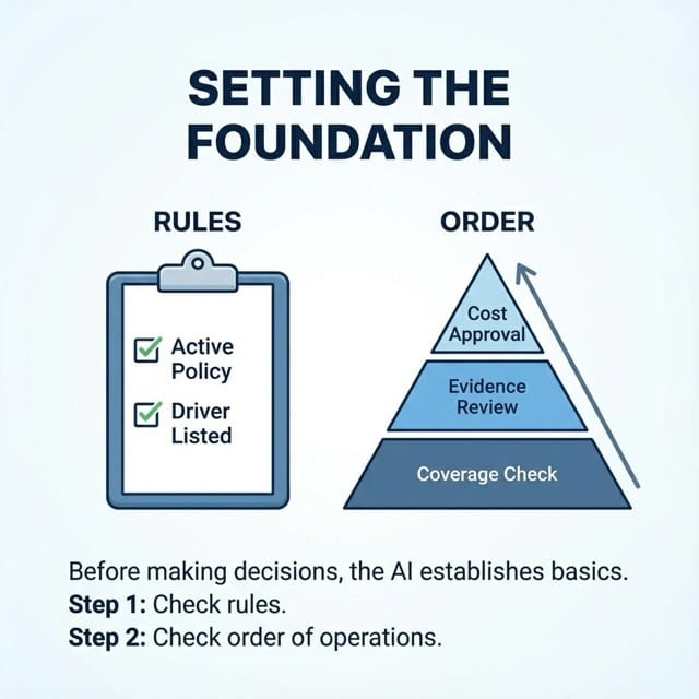 Before doing anything, the AI must check rules. These include laws, company policies, and instructions. Rules matter more than speed. If rules conflict, the most important rule wins.