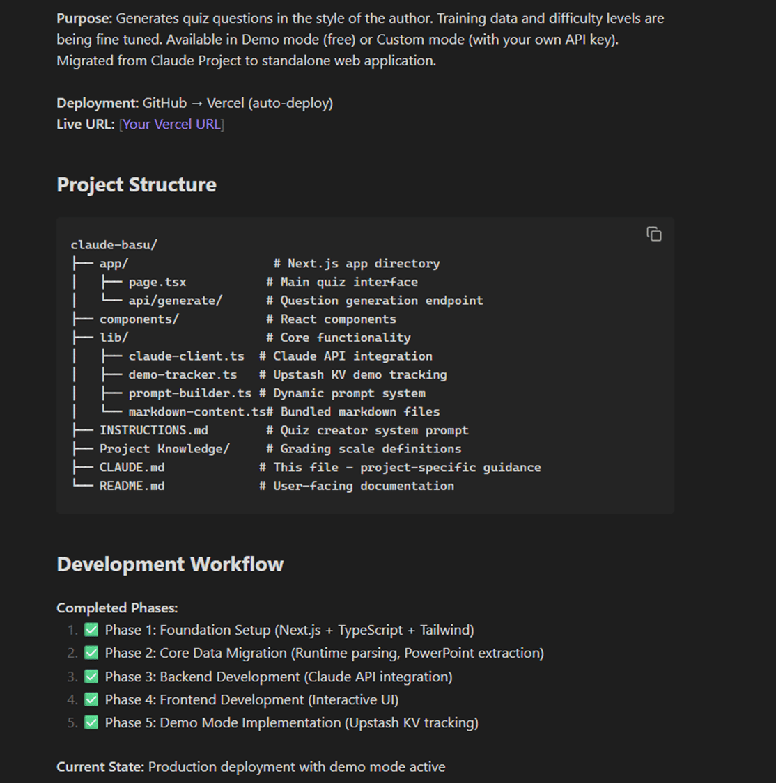 The quiz generator is live. It works. You can try it on my site. I shipped a production system with rate limiting, intelligent caching, and a freemium model (two free demos, then bring your own API key) in the time it used to take me to manually format a couple of rounds of quiz slides.